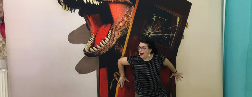 Despite it being asymmetrical, it is balanced. The visual weight is evenly distributed because there are objects on both sides of the piece, so it seems “in harmony.” Things would appear off if there were only the dinosaur, myself, and Dana as it would appear “heavy” on the right.